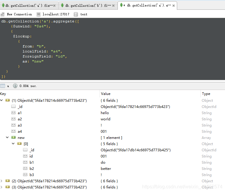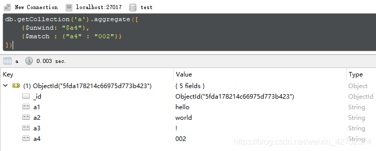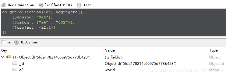 { $unwind: "$a4"}, // 这一行处理后的结果 给一行处理