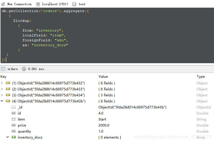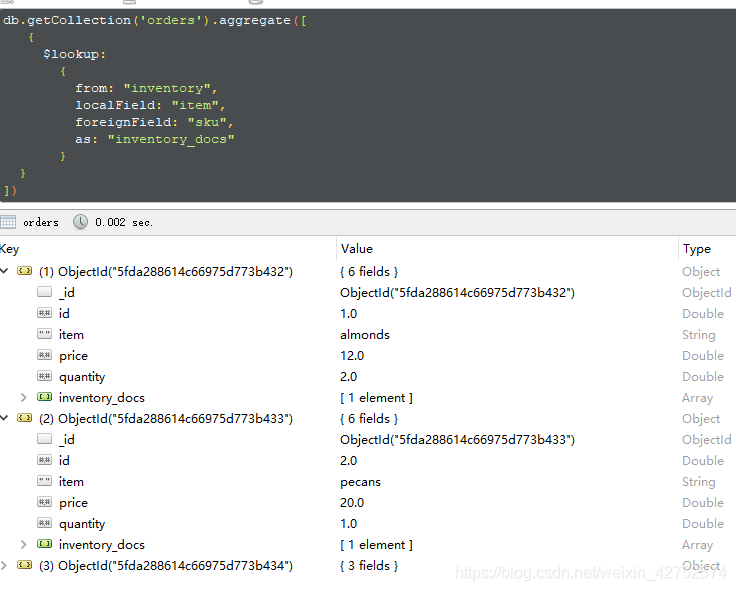从集合order中逐个获取文档处理,拿到一个文档后,会根据localField 值 遍历被 Join的 inventory集合(from: “inventory”),看inventory集合文档中 foreignField值是否与之相等。