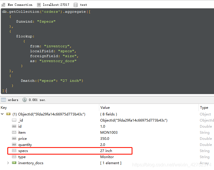 输出文档中的specs 对应的数据变成了字符串类型(原集合为数组)。 原因是 $unwind