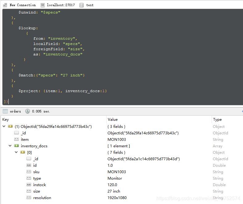 如果相等,就把符合条件的inventory文档 整体内嵌到聚合框架新生成的文档中,并且新key 统一命名为 inventory_docs。