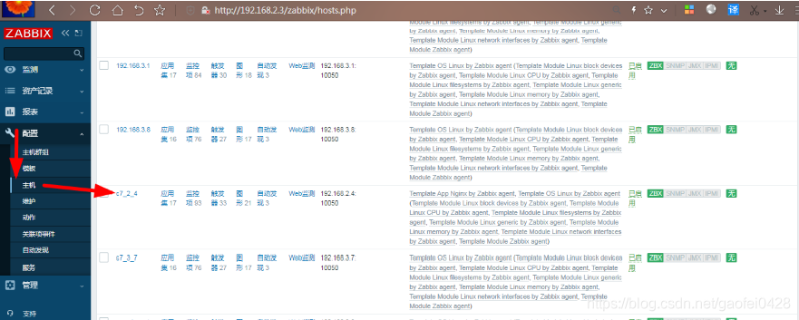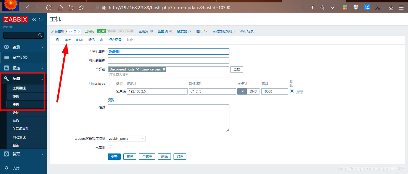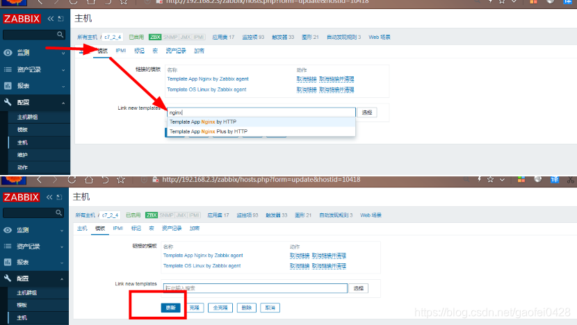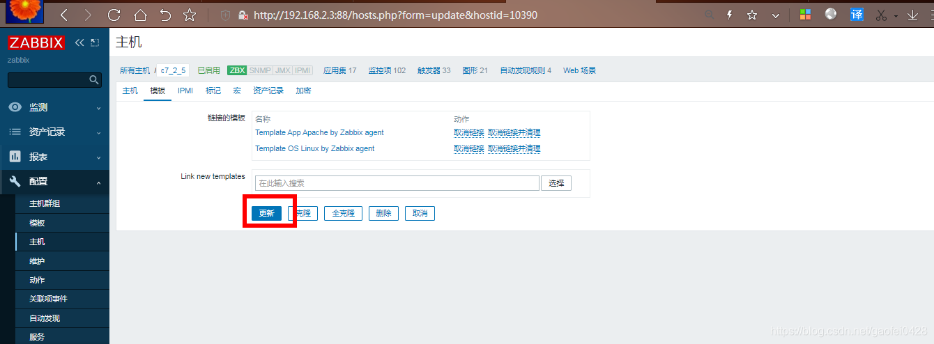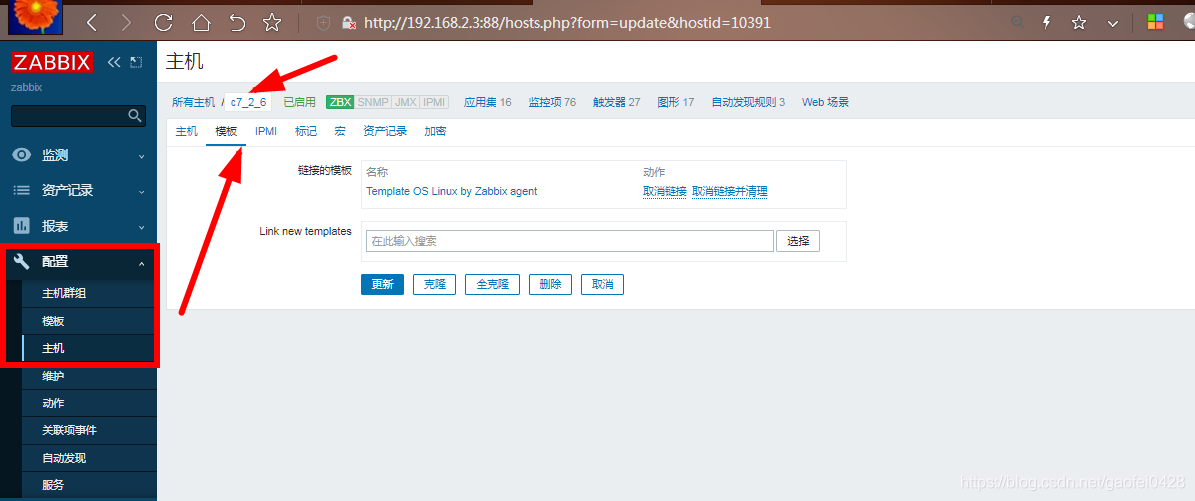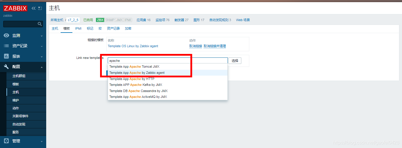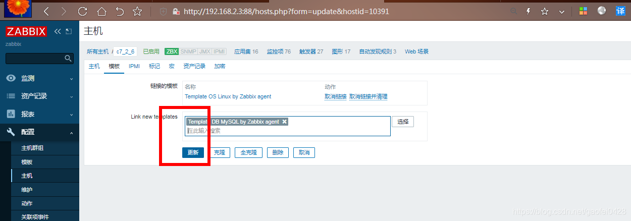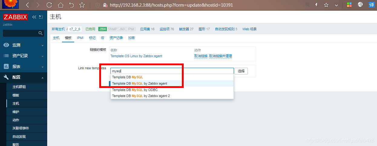 2、在 zabbix 平台上,给被监控主机上关联 mysql 监控模板