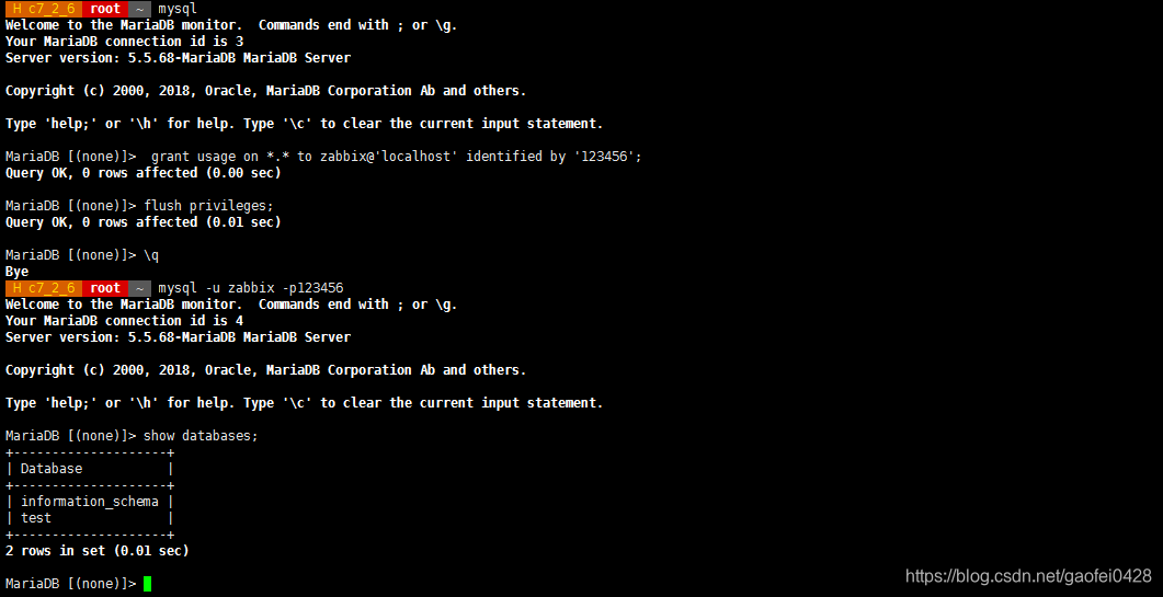 - 注:MySQL 用户设置密码后,只要在 client 字段下添加用户名和密码就可以免密码登录。每次登录MySQL 的交互界面,只需键入 mysql 命令,即可默认将 host, user, password 的值根据 client.cnf中的内容传给 mysql 命令,进行 mysql 的登录操作。