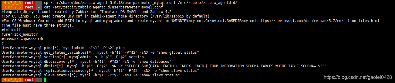 - cp /usr/share/doc/zabbix-agent-5.0.13/userparameter_mysql.conf /etc/zabbix/zabbix_agentd.d/