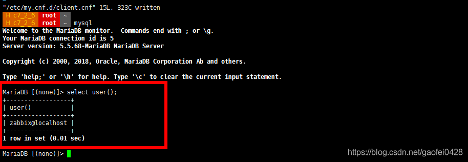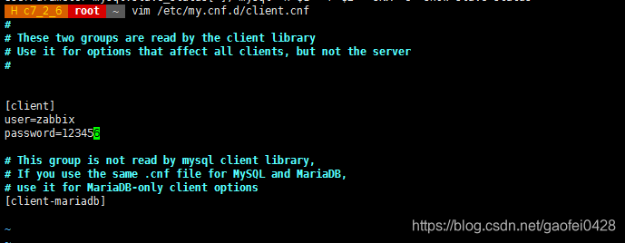 - 注:这里记录了,zabbix-agent 要对 mysql 监控的数据。 模板文件中提示我们需要创建.my.cnf 配置文件, 我们直接在数据库的/etc/my.cnf.d/client.cnf 文件中,添加 zabbix 监控 mysql 使用的帐号就可以了。