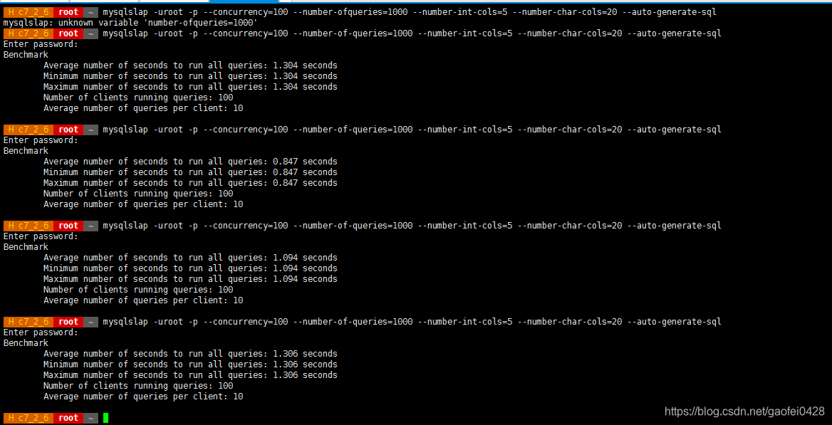 mysqlslap -uroot -p --concurrency=100 --number-of-queries=1000 --number-int-cols=5 --number-char-cols=20 --auto-generate-sql - 参数说明:
