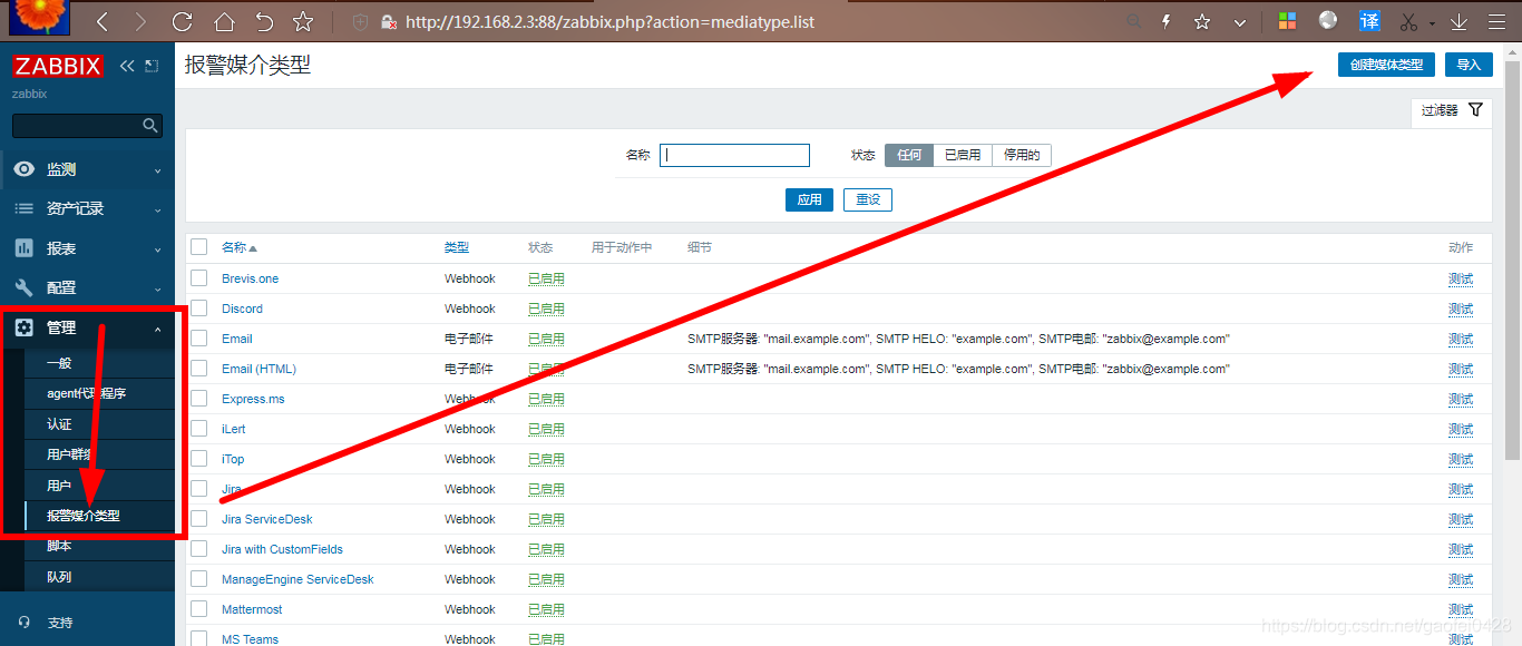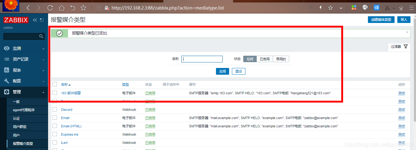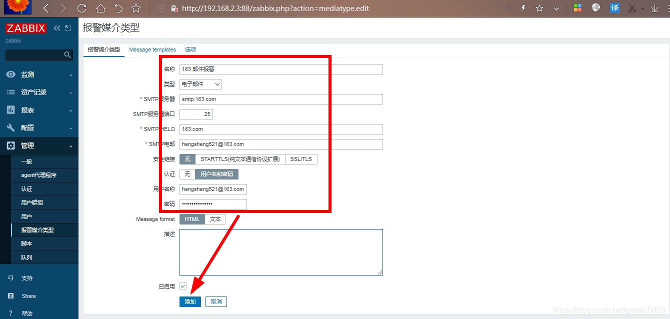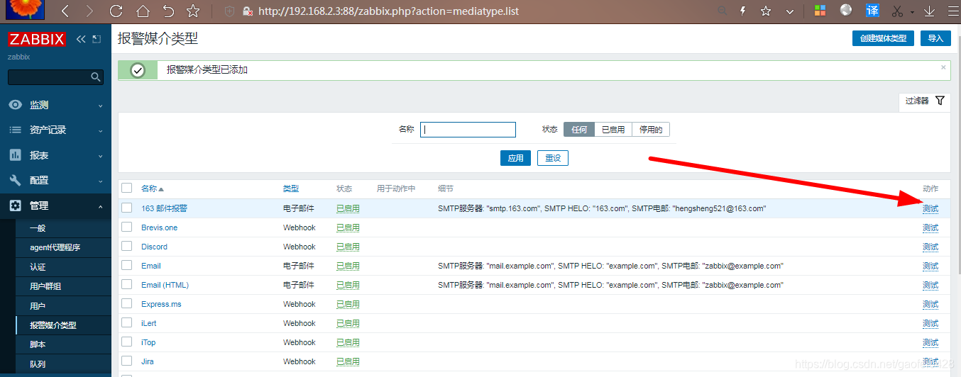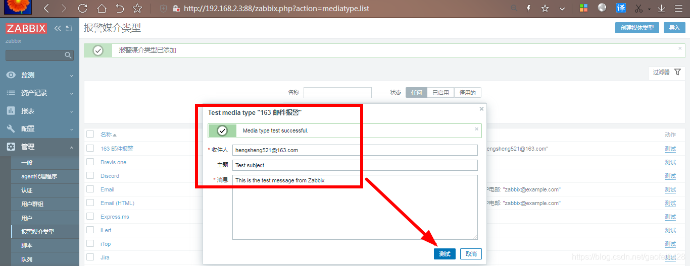 - 配置报警媒介,使用脚本发送邮件。名称: 163 邮件报警
