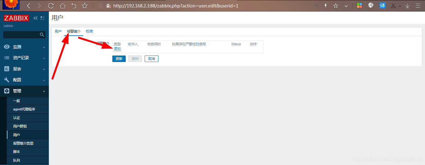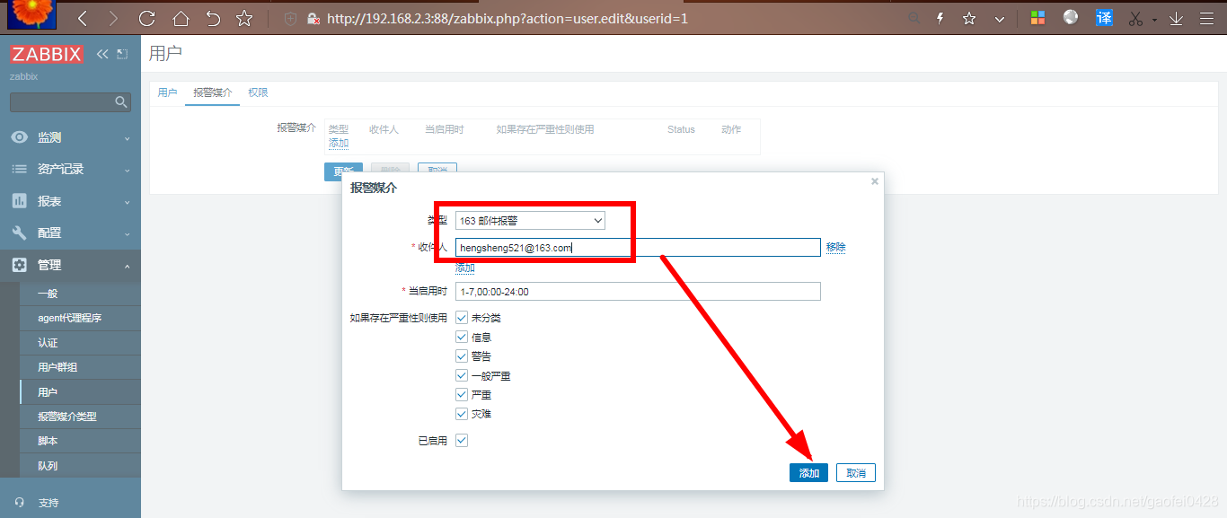 - 设置报警用户(zabbix 触发报警是发送给 zabbix 用户所绑定的邮箱。所以要在用户中配置相关报警媒介)