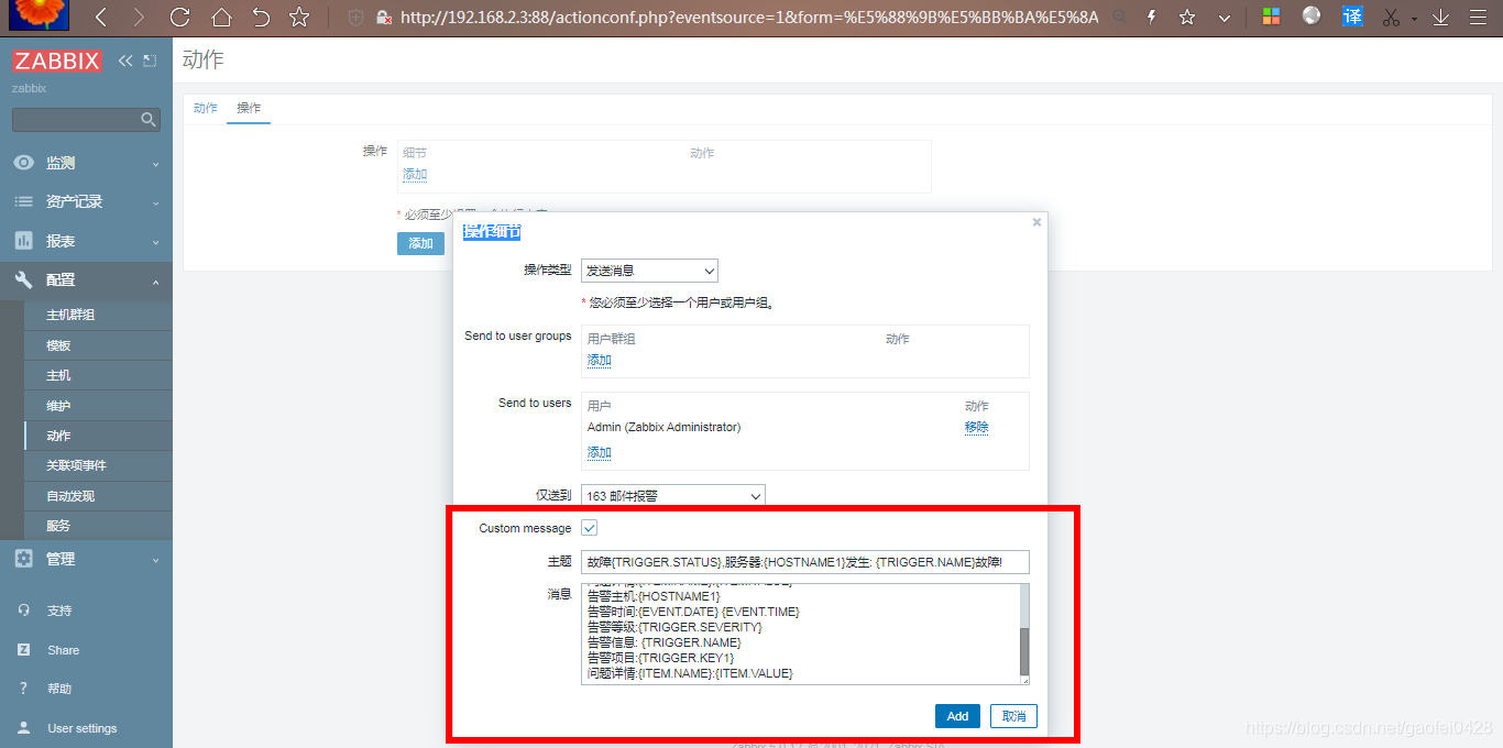 主题:故障{TRIGGER.STATUS},服务器:{HOSTNAME1}发生: {TRIGGER.NAME}故障! - 消息: