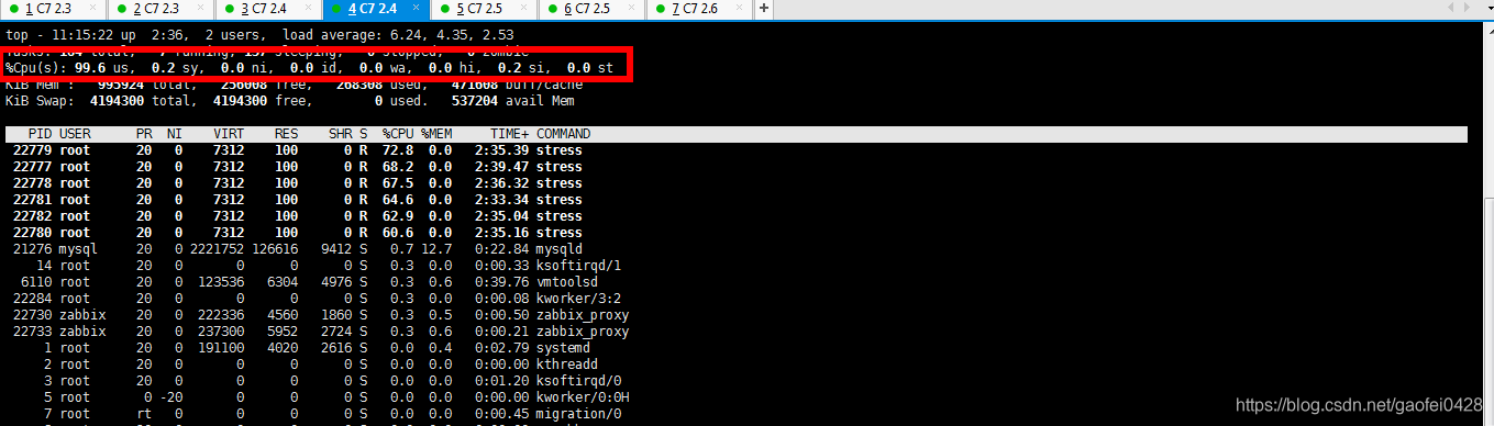 再打开一个终端,使用 top 命令查看,1 核 cpu 已经占满 100%