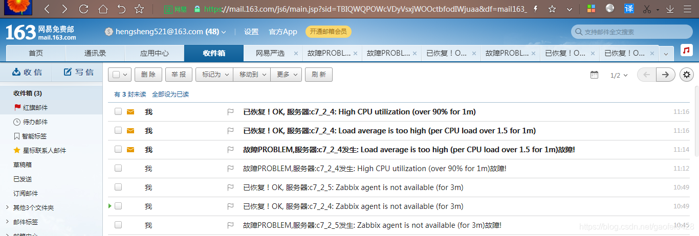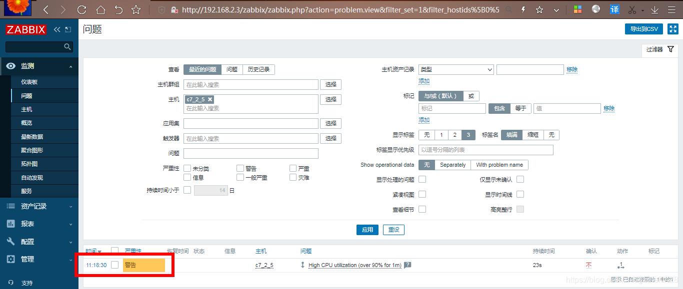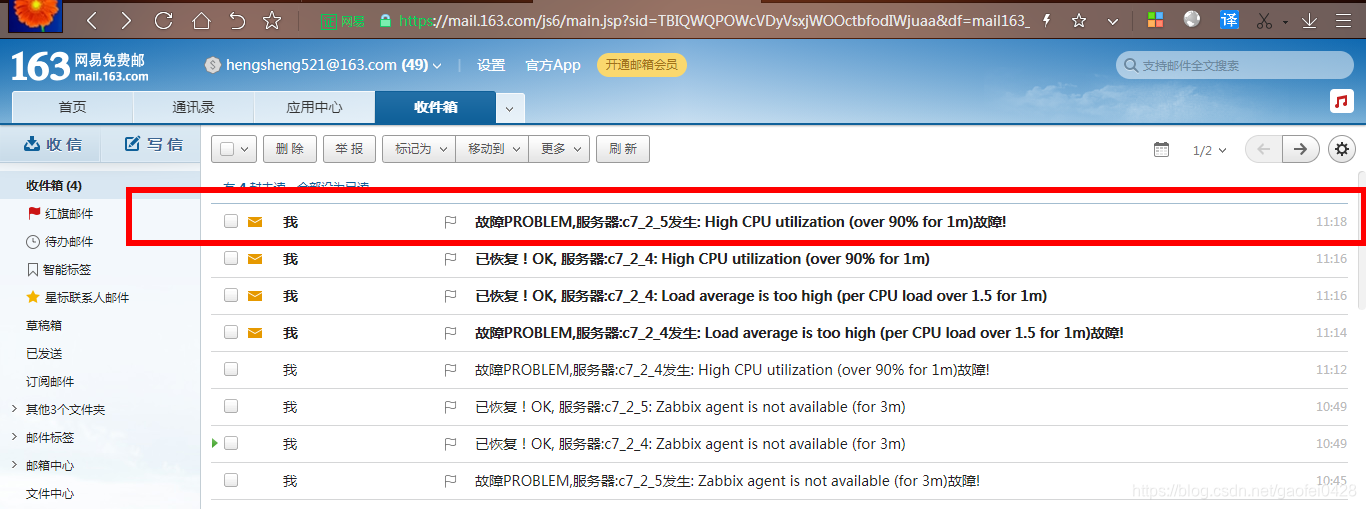 - 可以看到 5 分钟内 cpu 负载达到预设值会发出告警