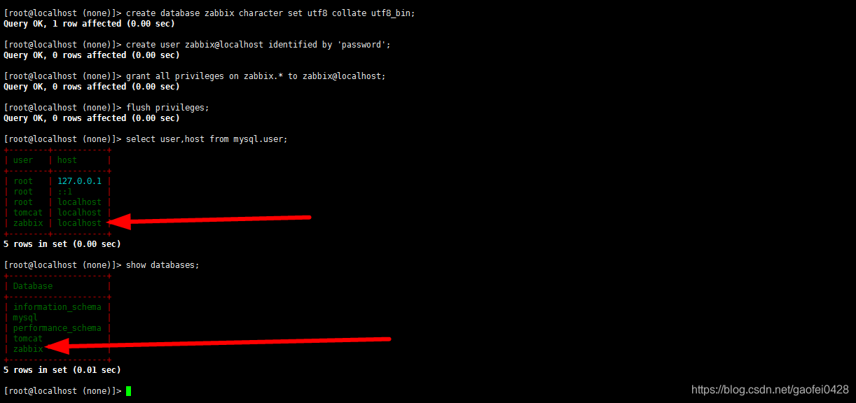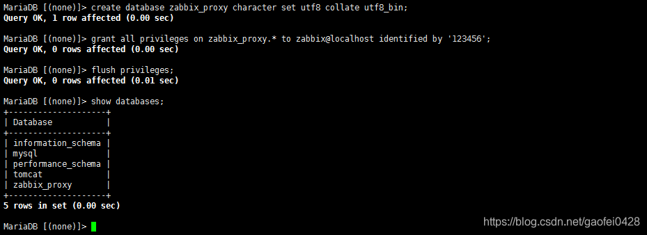 MariaDB [(none)]> create database zabbix_proxy character set utf8 collate utf8_bin; #创建代理库