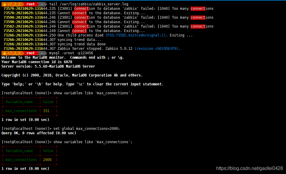 - set global max_connections=1000;(设置最大连接数为1000,可以再次查看是否设置成功)