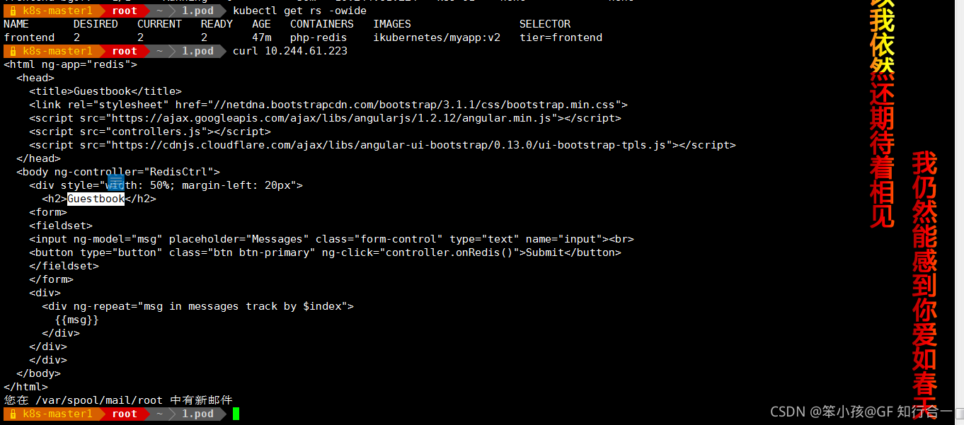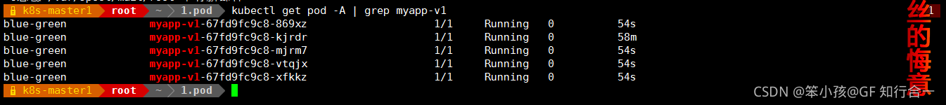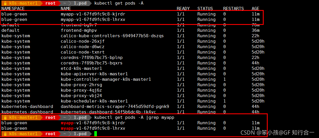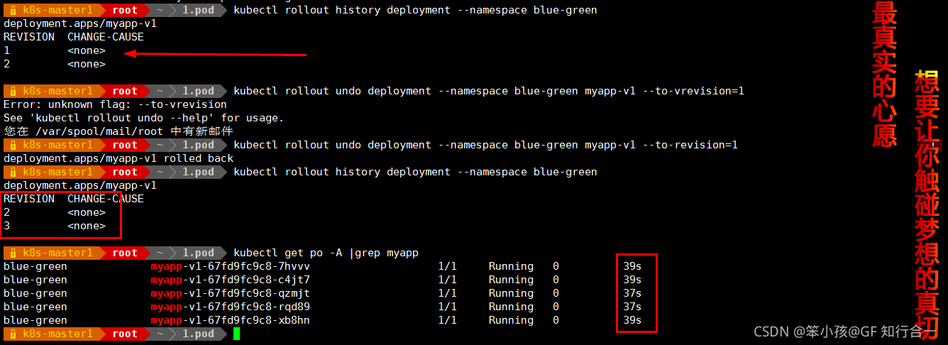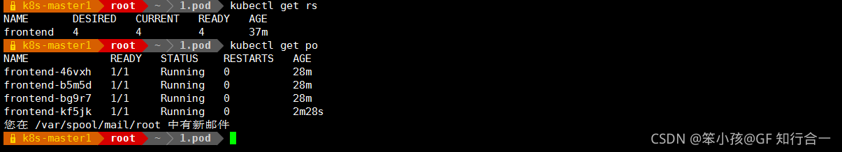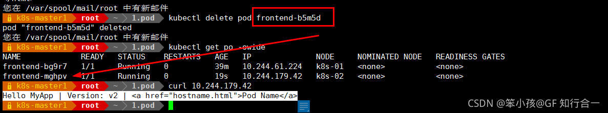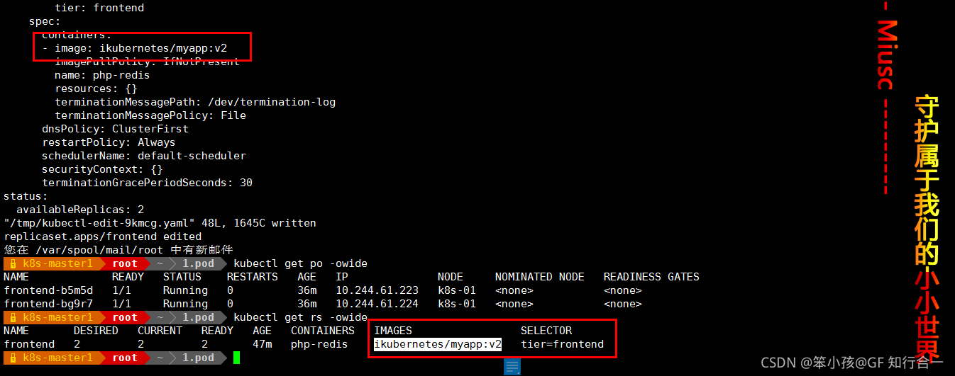 重新生成了一个新的 pod:frontend-mghpv 发现新生成的 pod 的镜像已经变成了 myapp 的,说明更新完成了