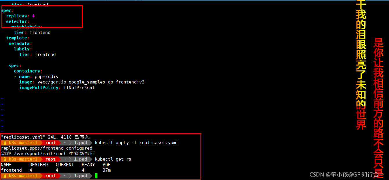 - ReplicaSet 最核心的功能是可以动态扩容和回缩,如果我们觉得两个副本太少了,想要增加,只需要修改配置文件 replicaset.yaml 里的 replicas 的值即可,原来 replicas: 3,现在变成 replicaset: 4,修改之后,执行如下命令更新: