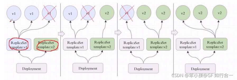 生产环境如果升级,可以删除一个 pod,观察一段时间之后没问题再删除另一个 pod,但是这样需要人工干预多次;实际生产环境一般采用蓝绿发布,原来有一个 rs1,再创建一个 rs2(控制器),通过修改 service 标签, service 可以匹配到 rs2 的控制器,这样才是蓝绿发布,这个也需要我们精心的部署规划,有一个控制器就是建立在 rs 之上完成的,叫做 Deployment