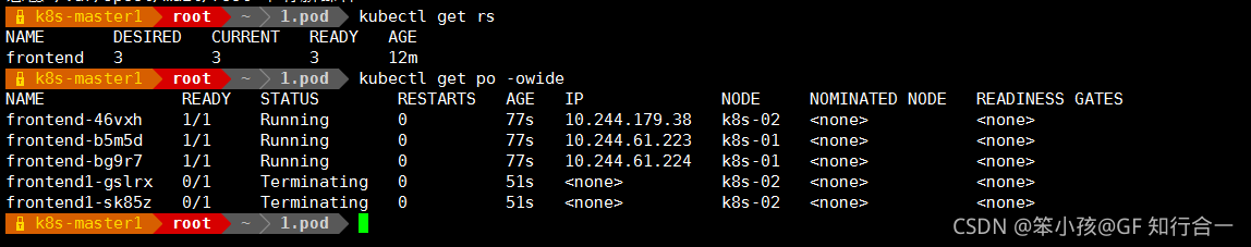 pending 表示正在进行调度,ContainerCreating 表示正在创建一个 pod,running 表示运行一个 pod,running 起来一个 pod 之后再 Terminating(停掉)一个 pod,以此类推,直到所有 pod 完成滚动升级