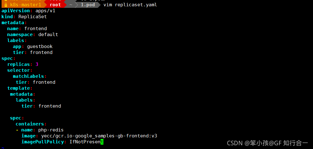 - 如果直接修改 replicaset.yaml 文件,把 image: yecc/gcr.io-google_samples-gb-frontend:v3 变成- image: ikubernetes/myapp:v2