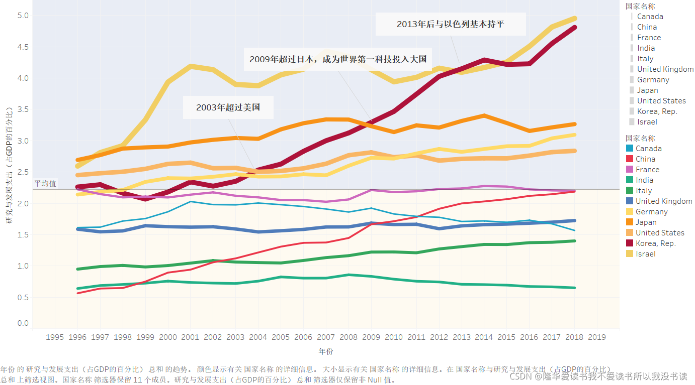 当说到科技投入时,大多数人想都没想会认为欧美国家必然是这方面的佼佼者,让人信服的原因在于欧美国家引领了多次工业革命。但事实上当对数据可视化后却有惊人的发现: