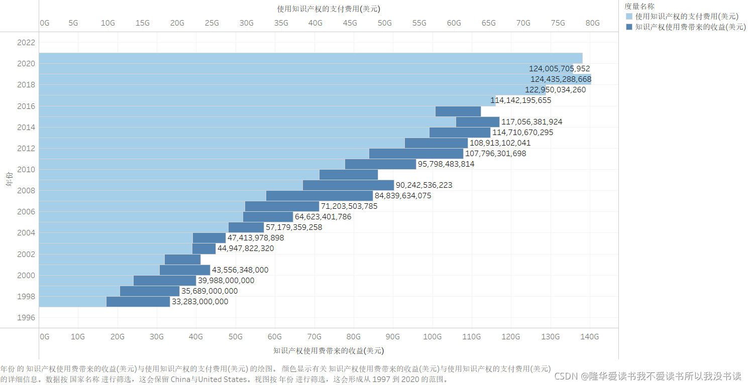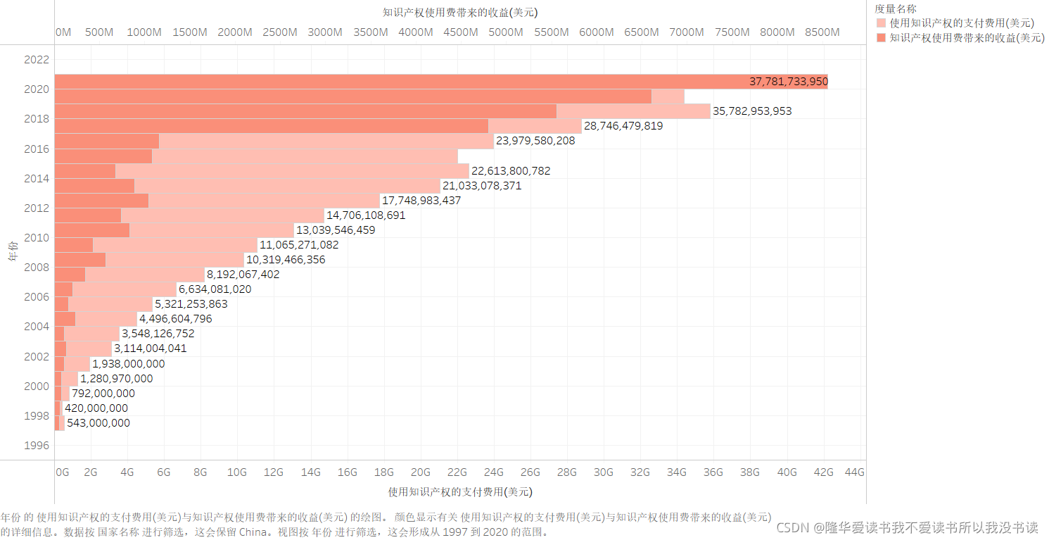 将 中国 使用知识产权的支付费用和知识产权使用费带来的收益进行可视化:
