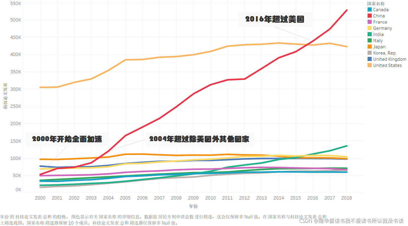 可以看到,从2000年开始,中国科技期刊文章迎来“新春天”,到2004年之后,全球范围内的国家的科技期刊发表量已经进入平稳期,而中国仍然继续增长加速,到2016年超过美国,成为发表量最多的国家。