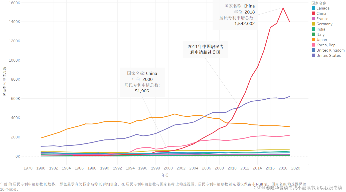 可以看到从2000年开始,中国发明专利申请数量呈井喷式增长,2000年时居民(包含非居民)专利申请总数为51906件,到2018年已经达到1542002件,18年间专利申请数量已经翻了近30倍。并且在2011年中国第一次在专利总量超过美国,跃升至第一位,成为提交国际专利申请量最多的国家,从而打破了美国长达40年的专利申请霸主地位。