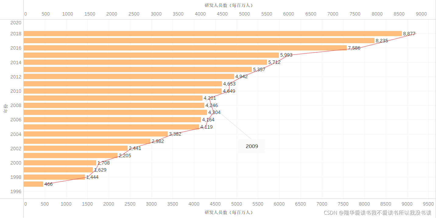 为了印证猜想,我们对中国(包含香港、澳门)的研发人员数(每百万人)可视化。