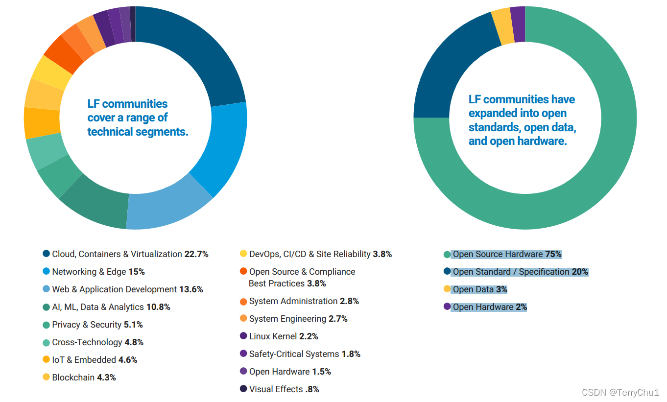 这20年里,有超过1900名成员和成千上万的开发人员参与了一些最重要和最活跃的开源项目,在跨行业的技术领域进行合作评级。Linux基金会涉猎一系列的技术领域,包括云计算、人工智能、机器学习、数据分析、物联网和嵌入式、区块链等等。Linux基金会已经扩展到开放标准、开放数据和开放硬件。