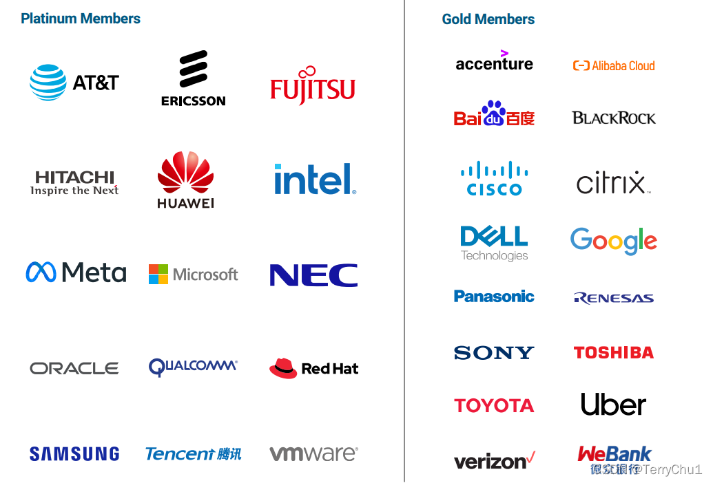 在Linux基金会中,白金会员包括华为、腾讯、微软、三星、Oracle、Meta、英特尔等知名企业,黄金会员则有百度、阿里云、谷歌、索尼、优步等。