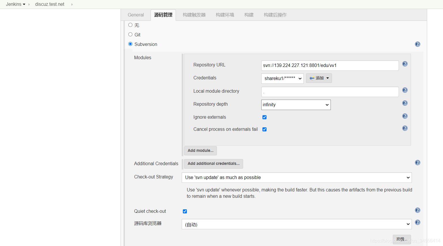 上面这些操作最主要的就是写了一个仓库地址 ,现在这个任务就一个功能是将svn仓库的代码文件拉取下来,拉取到jenkins服务器。