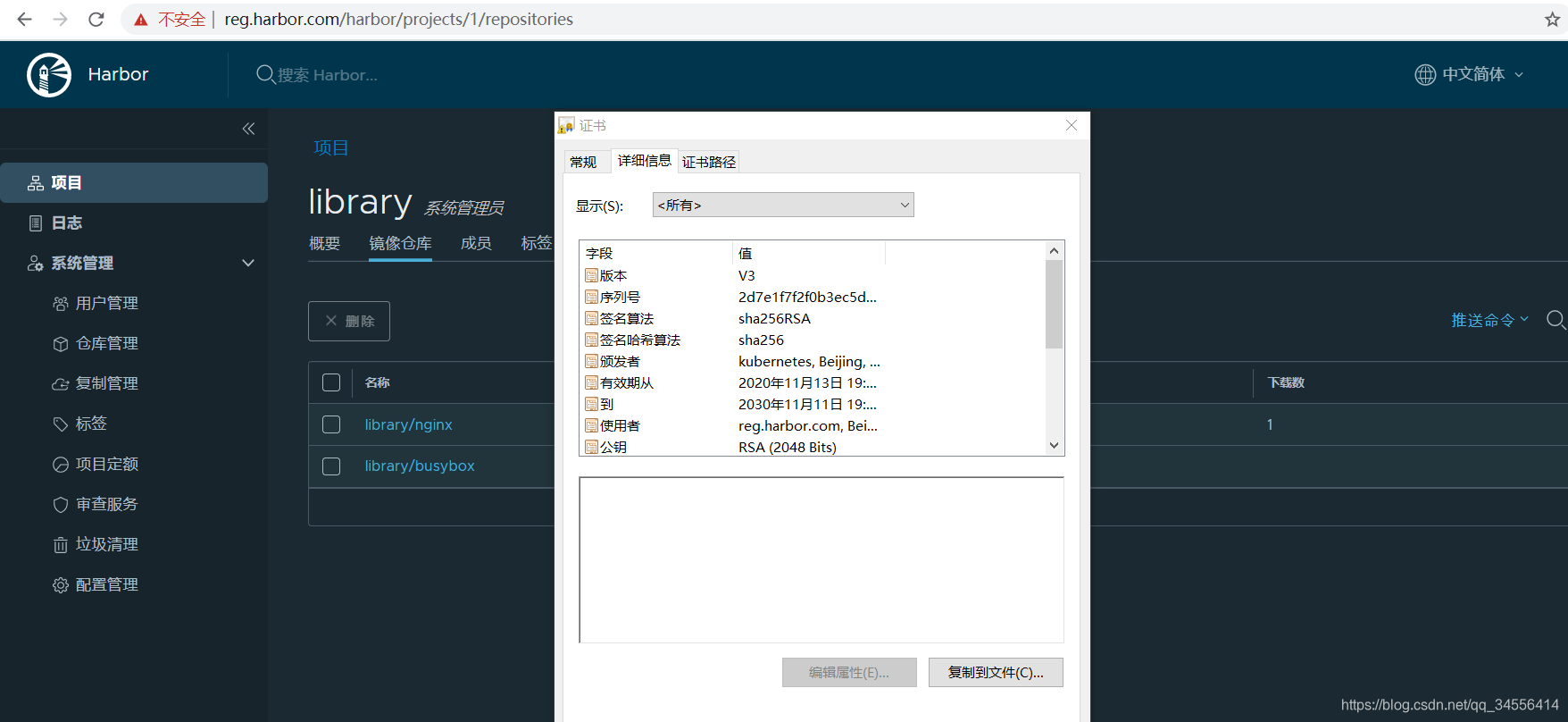 生成好之后会为reg.harbor.com域名颁发两个证书,一个是私钥 reg.harbor.com-key.pem,另外一个是数字证书reg.harbor.com.pem