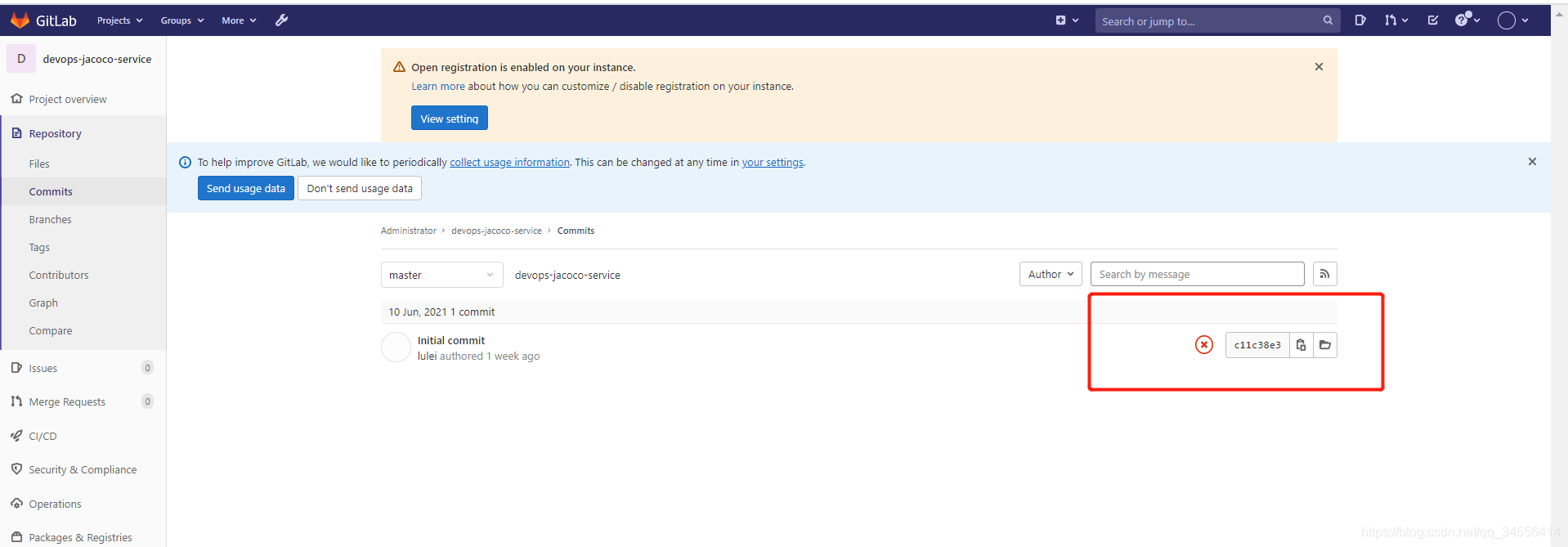 将扫描结果和git commit去做一个关联,下面红色方框的就是commit id,每次提交都会有一个id