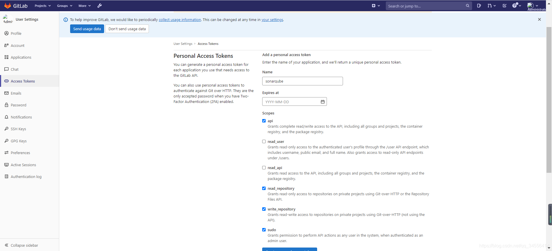user_token 这个需要去gitlab里面去创建( sonar.gitlab.user_token=vxLDfBedyUzPRtBZzFUu)