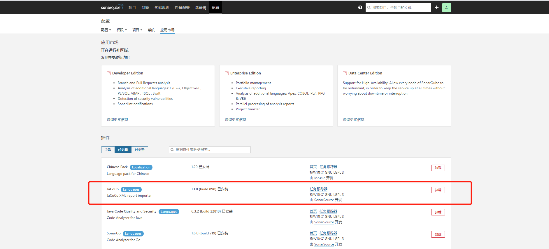 SonarQube安装Jacoco插件(8.9.1 版本可以跳过,已经集成)