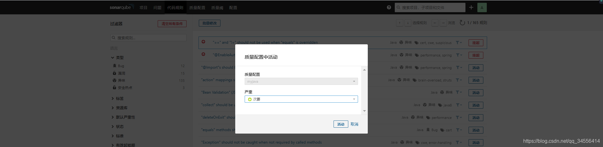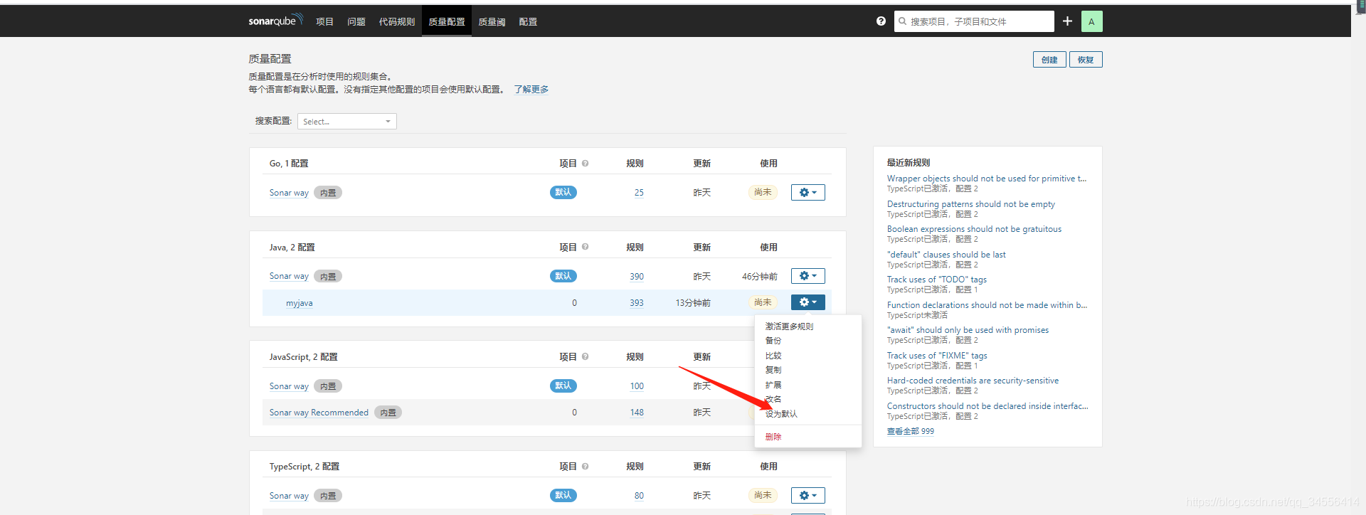 进入质量配置页面, 可以看到所有的语言规则配置。在这里可以看到规则的使用情况。