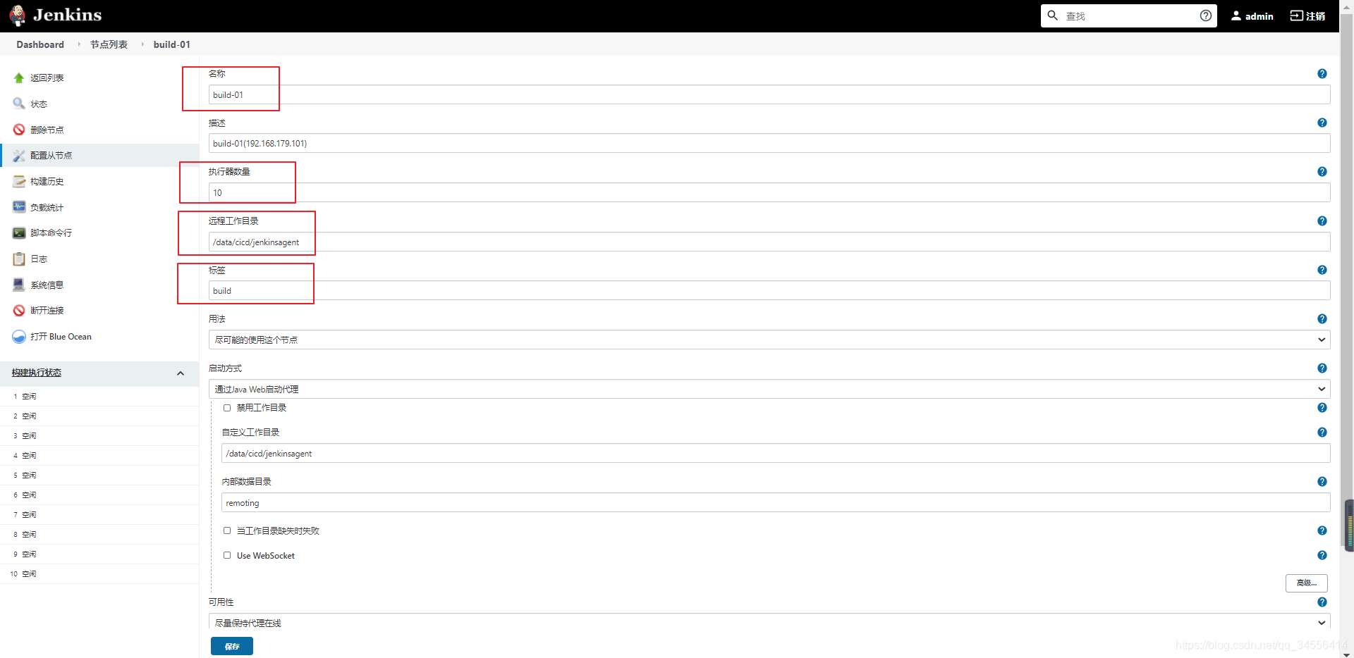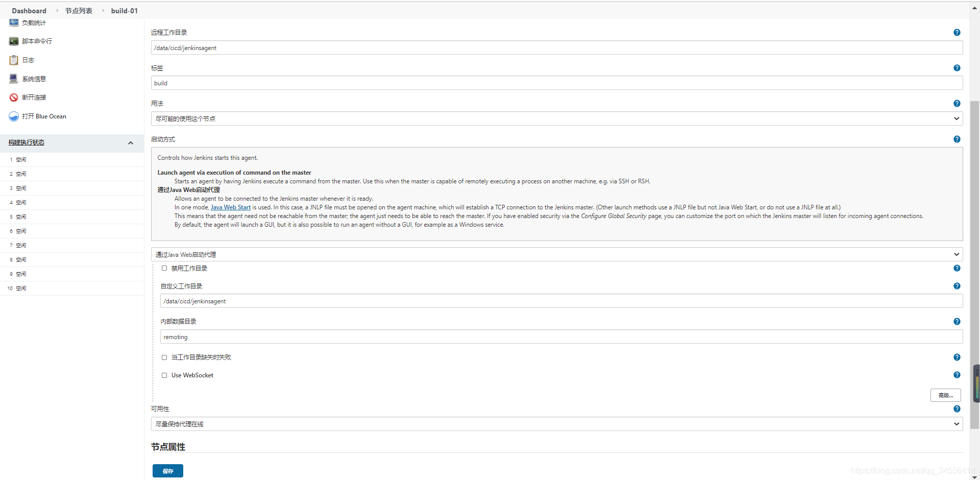 [root@jenkins-slave ~]# java -jar agent.jar -jnlpUrl http://192.168.179.100:8080/computer/build-01/jenkins-agent.jnlp -secret @secret-file -workDir "/data/cicd/jenkinsagent"