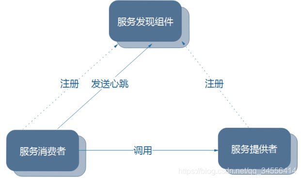 服务提供者、服务消费者、服务发现组件这三者之间的关系大致如下: