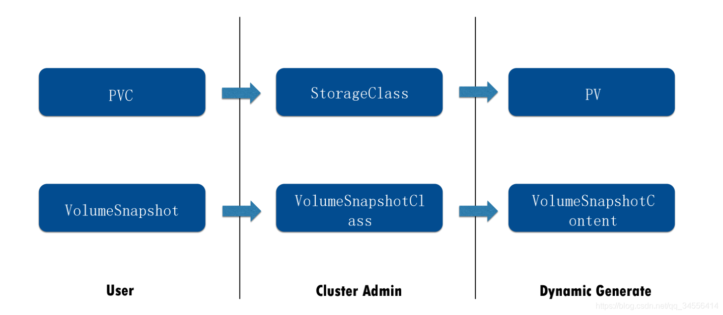 我们知道,K8s 中通过 pvc 以及 pv 的设计体系来简化用户对存储的使用,而存储快照的设计其实是仿照 pvc & pv 体系的设计思想。当用户需要存储快照的功能时,可以通过 VolumeSnapshot 对象来声明,并指定相应的 VolumeSnapshotClass 对象,之后由集群中的相关组件动态生成存储快照以及存储快照对应的对象 VolumeSnapshotContent。如下对比图所示,动态生成 VolumeSnapshotContent 和动态生成 pv 的流程是非常相似的。