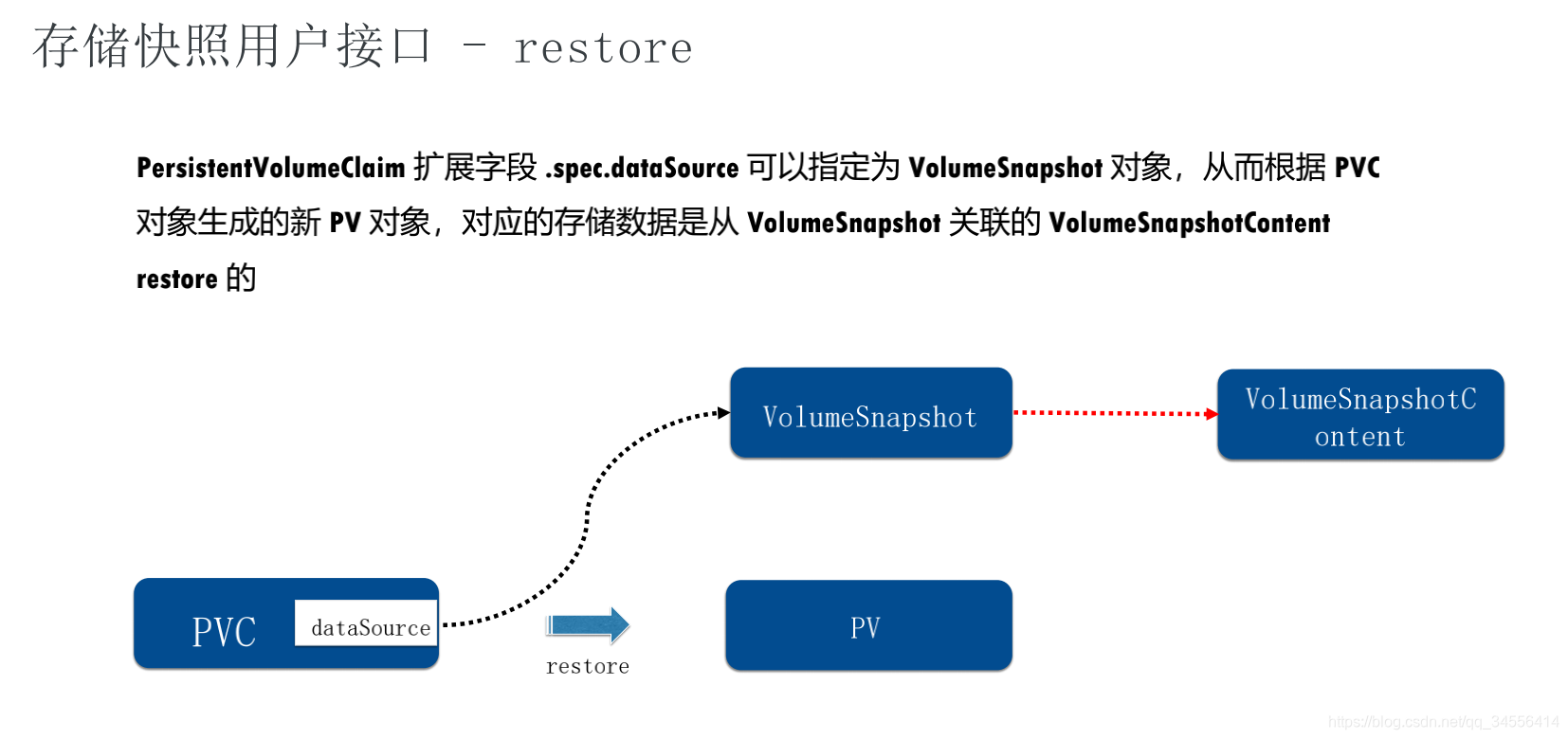如上所示的流程,可以借助 PVC 对象将其的 dataSource 字段指定为 VolumeSnapshot 对象。这样当 PVC 提交之后,会由集群中的相关组件找到 dataSource 所指向的存储快照数据,然后新创建对应的存储以及 pv 对象,将存储快照数据恢复到新的 pv 中,这样数据就恢复回来了,这就是存储快照的restore用法。