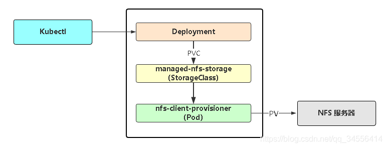 当前申请的pv请求会给到storageClass,storageClass会将请求交给之前创建的扩展插件处理,自动创建pv,也就是不需要手工创建pv