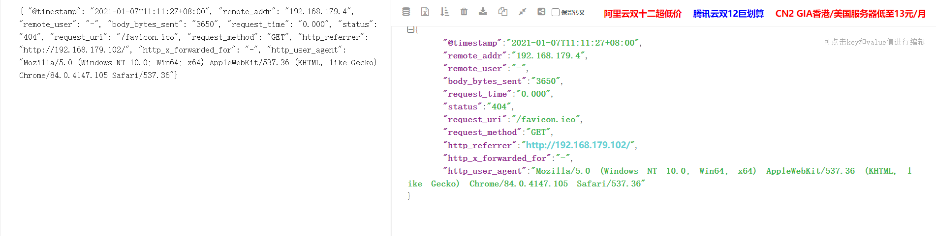 这里filebeat采集的就是json格式,不需要特殊配置filebeat,在logstash这里还要使用json插件