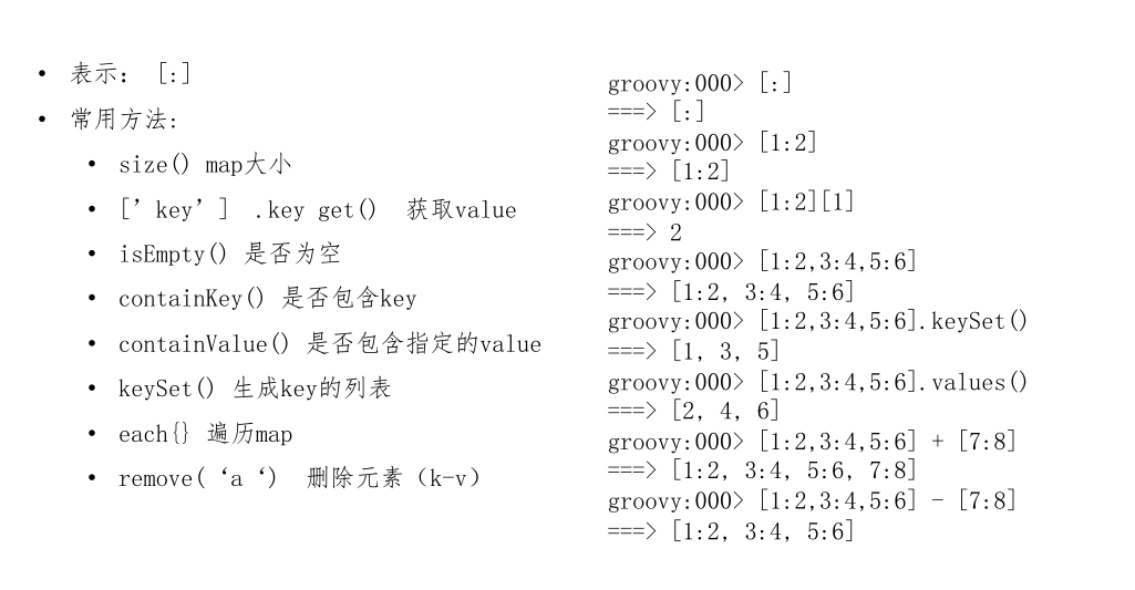 有时在其他语言中称为字典或关联数组,Groovy 特征映射。映射将键与值关联起来,用冒号分隔键和值,每个键/值对用逗号,整个键和值用方括号括起来。