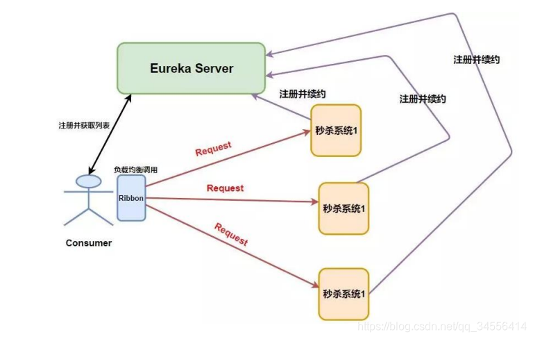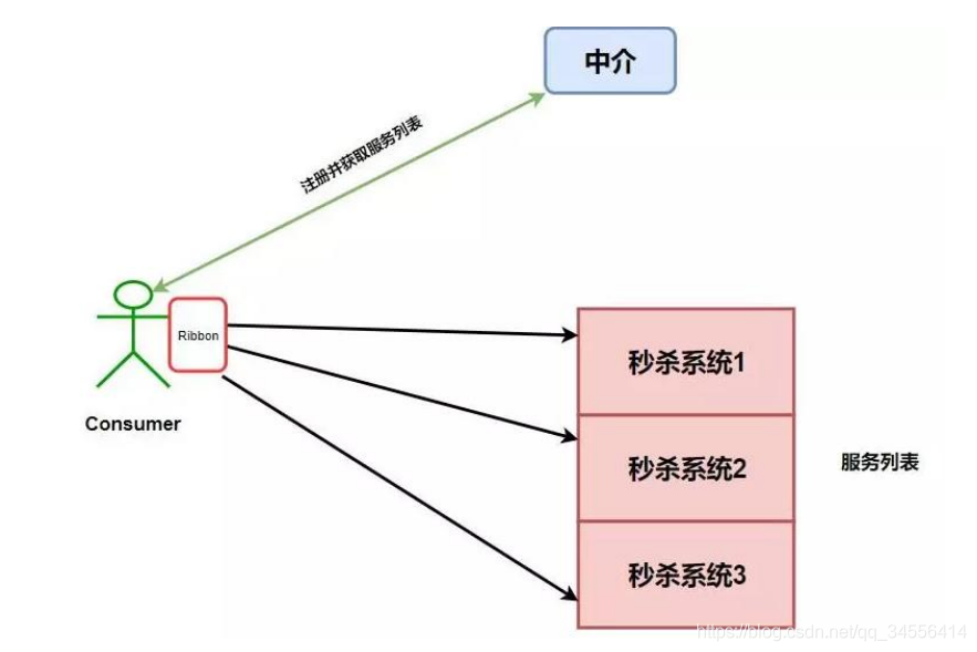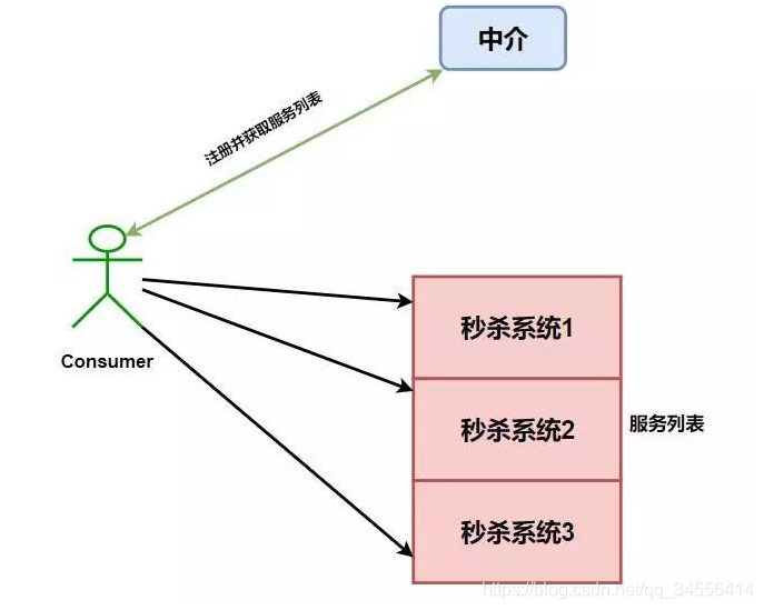 比如我们设计了一个秒杀系统,但是为了整个系统的 高可用 ,我们需要将这个系统做一个集群,而这个时候我们消费者就可以拥有多个秒杀系统的调用途径了,如下图: